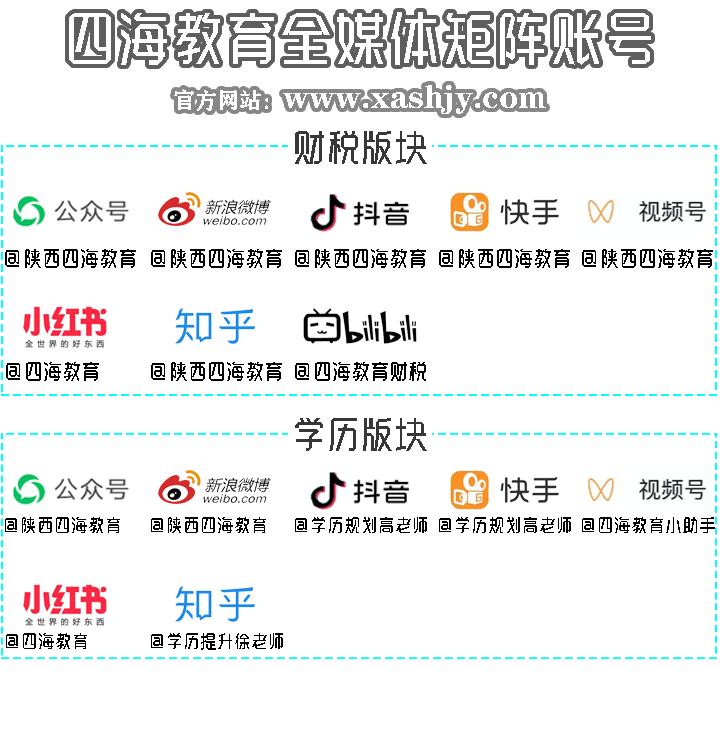 陕西四海教育科技有限公司专业财税培训,在财税先后服务学员近万名,关注四海教育官方媒体矩阵平台,获取海量免费视频课和一手新闻资讯政策,为你的考证保驾护航。